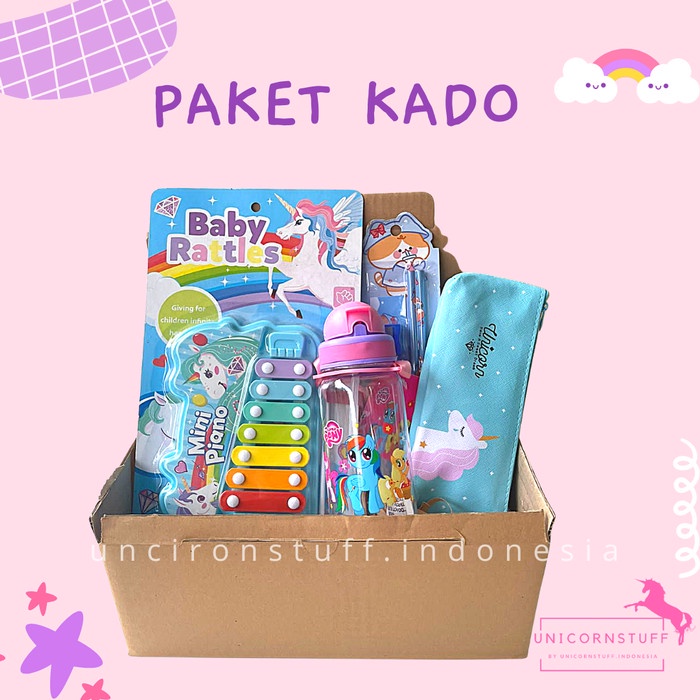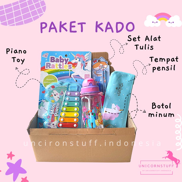 Unicorn Box Include : 1 Mainan Piano 1 Tempat pensil 1 Botol minum 1 Set alat tulis Free Box & packing bubble wrap silahkan menambahkan barang kardus bekas dari toko kami agar box kardus hadiah dapat lebih aman