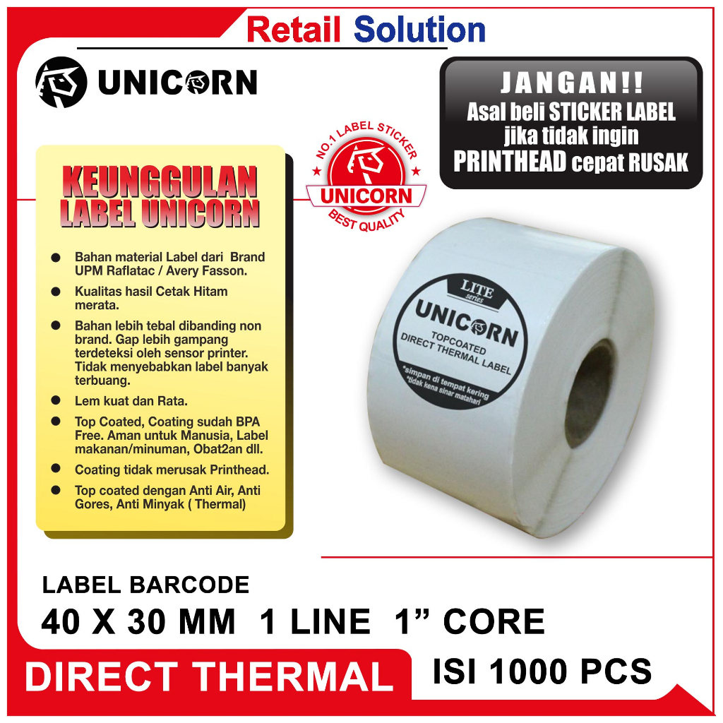 Keunggulan Label Unicorn Lite: 1. Kualitas hasil Cetak Hitam merata. 2. Lem kuat dan Rata. 3. Top Coated, Coating sudah BPA Free. Aman untuk Manusia, Label makanan/ minuman, Obat2an dll. 4. Top coated dengan Anti Air, Anti Gores, Anti Minyak 5. Harga terjangkau/Ekonomis.