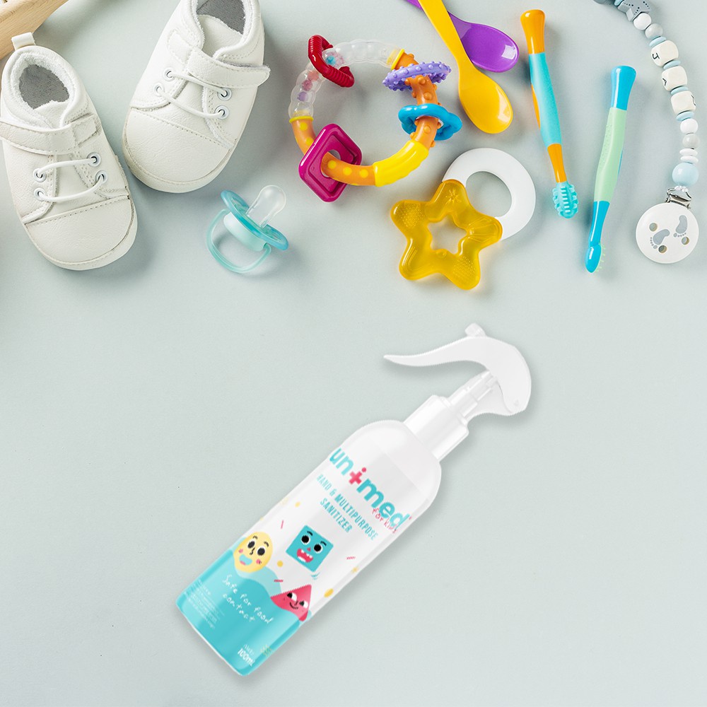 HAND & MULTIPURPOSE SANITIZER UNIMED KIDS. Bekerja cepat untuk membasmi bakteri penyebab infeksi pada anak. disimulasikan khusus dengan bahan organik yang aman untuk anak anak.