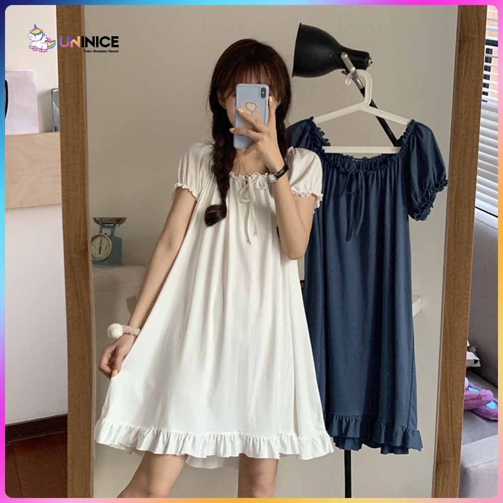 Detail UNINICE [Pengiriman Rahasia] Dress Lucu Lengan Pendek Model Longgar Warna Solid Baju Tidur