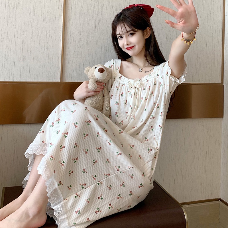 Pakaian Wanita > Pakaian Tidur & Piyama > Daster > UNINICE【Barang spot】 INS Baju Tidur Lengan Pendek Bermotif Bunga Kecil Yang Longgar Dengan Renda Manis Gaun Bermotif Bunga Setengah Panjang