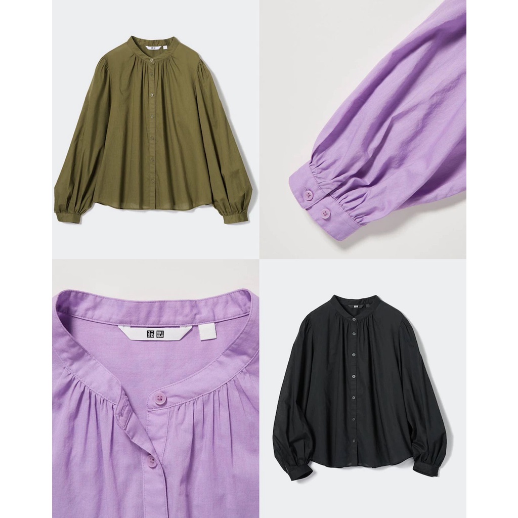 - Light cotton fabric. - Voluminous cut and sleeve design. - Gathers at the neckline of the stand collar add a stylish accent. - Shirttail features a slightly curved hem. - Works great on its own or as a light outer layer.