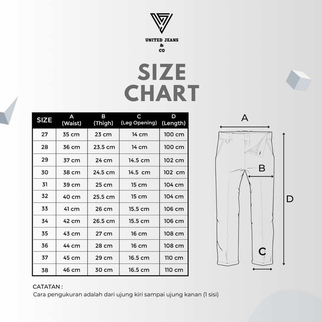 Size Chart : Lebar Pinggang (cm) x Lebar Paha (cm) x Lebar Bukaan Kaki (cm) x Panjang (cm). 28 : 36cm x 23,5cm x 14cm x 100cm 29 : 37cm x 24cm x 14,5cm x 102cm 30 : 38cm x 24,5cm x 14,5cm x 102cm 31 : 39cm x 25cm x 15cm x 104cm 32 : 40cm x 25,5cm x 15cm x 104cm 33 : 41cm x 26cm x 15,5cm x 106cm 34 : 42cm x 26,5cm x 15,5cm x 106cm 35 : 43cm x 27cm x 16cm x 108cm 36 : 44cm x 27,5cm x 16cm x 108cm