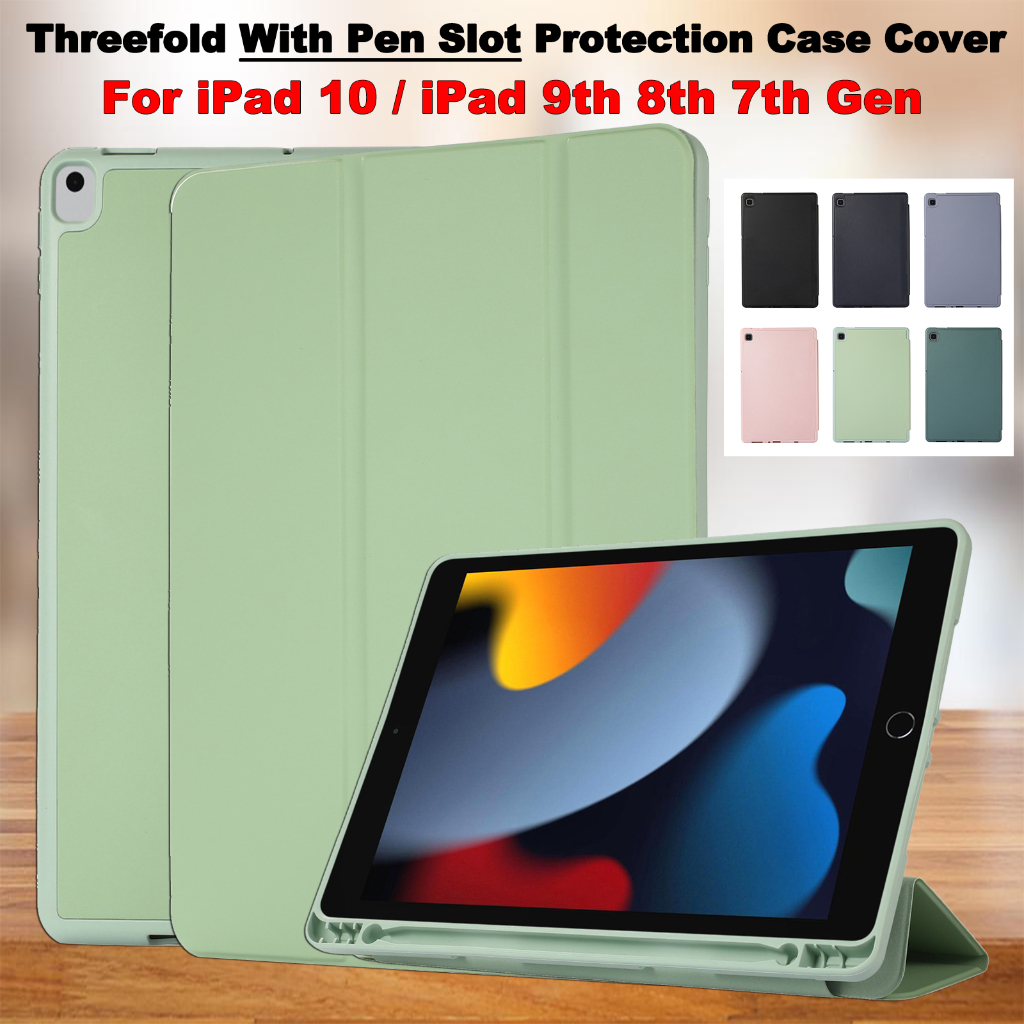 Detail Untuk iPad 10.2 (2021 /2020/2019) iPad 10.2-inci 9th 8th 7th Generasi A2603 A2604 A2428 Fashion Warna Solid Flip Stand Tablet Cover Tiga Lipat Slot Pulpen Soft TPU Pelindung Case