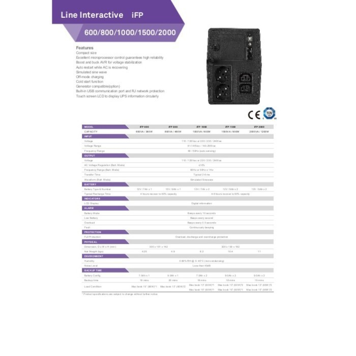 Feature : •Compact size •Excellent microprocessor control guarantees high reliability •Boost and buck AVR for voltage stabilization •Auto restart while AC is recovering •Simulated sine wave •Off-mode charging •Cold start function •Generator compatible(option) •Built-in USB communication port and RJ network protection •Touch screen LCD to display UPS information circularly