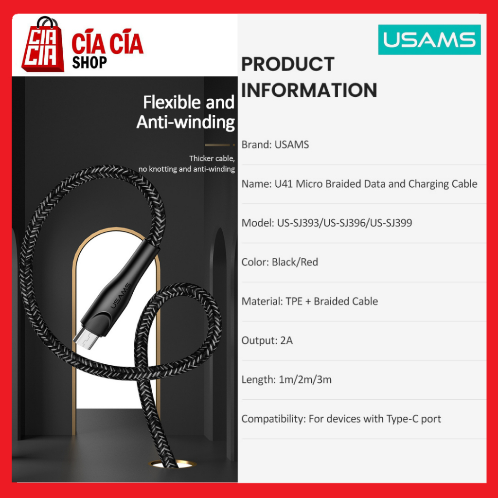 SPECIFICATION Model : U41 Current : 2A Material : TPE + Braided cable Length : 1m / 2m / 3m Compatibility : for devices with Micro USB Port