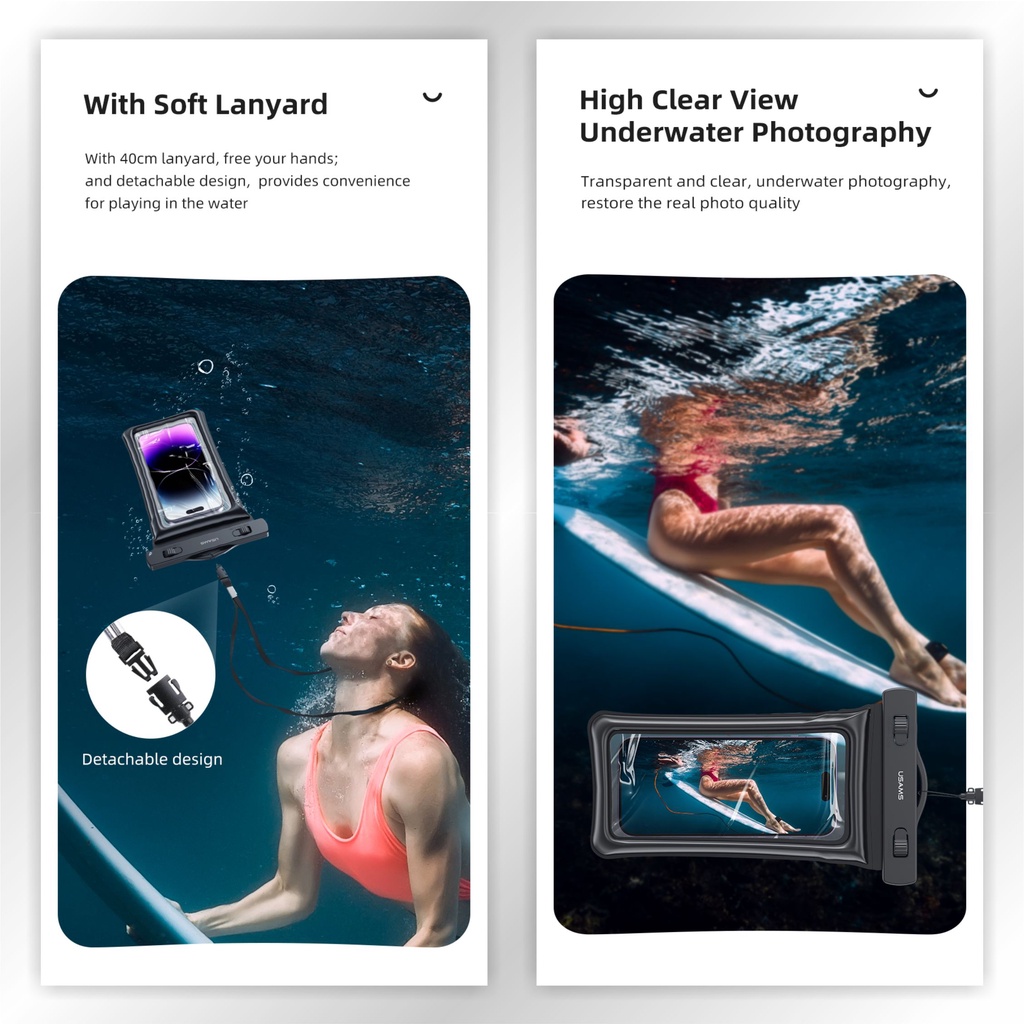 SPESIFIKASI : Brand : USAMS Model : YD011 Bahan : PVC Berat : ± 82g (termasuk lanyard) Ukuran Waterproof Bag : 145x260x12mm , Lanyard : 40cmx1cm Kompatibel : untuk smartphone Max 7 inch (185x85mm)