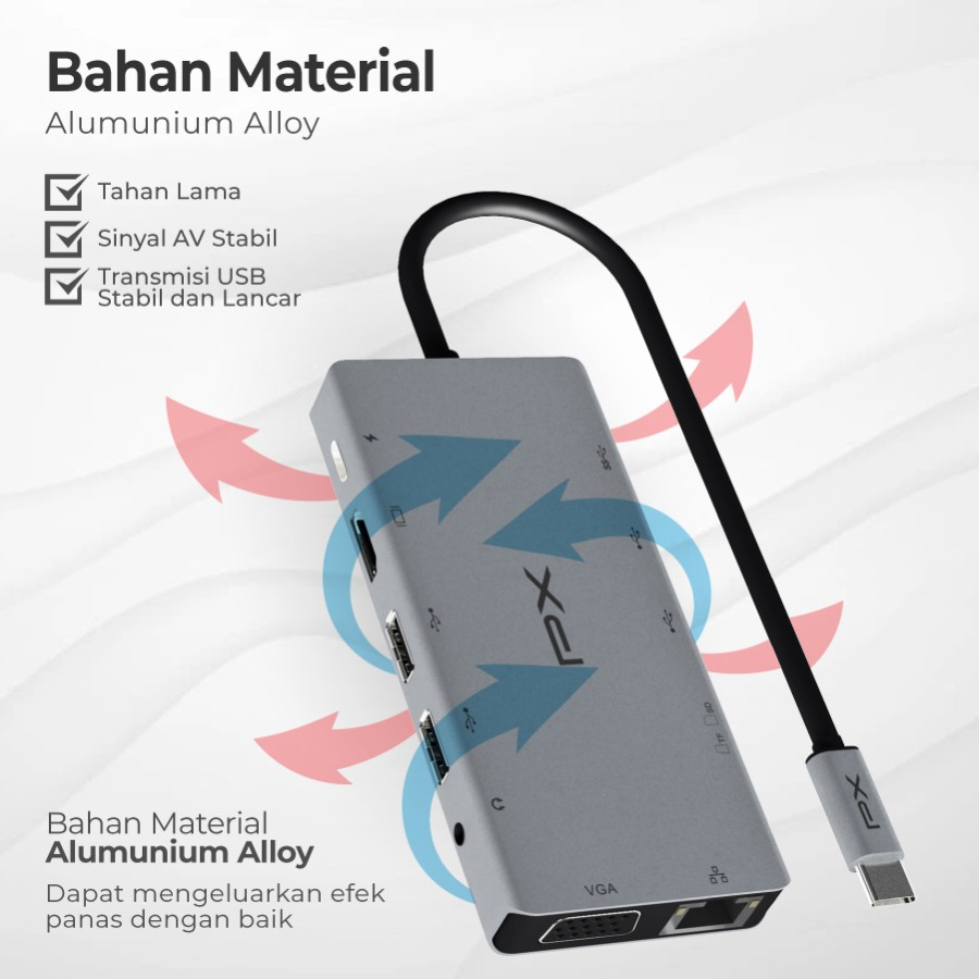 SPESIFIKASI : Merek : PX Model : UCH012 Material : Alumunium Alloy Warna : Space Grey Panjang Kabel : 15cm Input : USB C 3.1, Thunderbolt 3 Output : 1* USB C(PD), 1*USB 3.0, 4*USB 2.0, 1*HDMI, 1*VGA, 1*SD Card, 1*Micro SD, 1*LAN RJ45, 1*Jack Audio 3.5mm AWG : 32AWG+ 26 AWG Dimensi Produk : 120x55x150mm