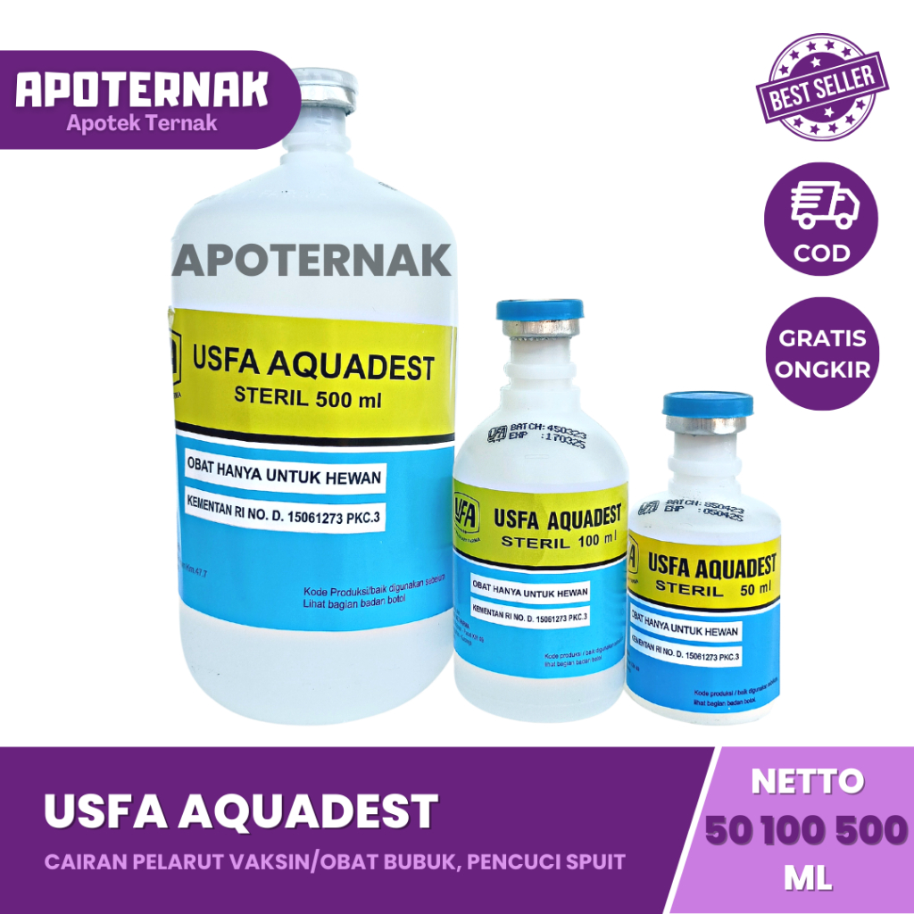 USFA AQUADEST berupa cairan, tidak berwarna, jernih, dan tidak berbau. USFA AQUADEST ini banyak digunakan sebagai pelarut vaksin atau obat dan pencuci spuit.