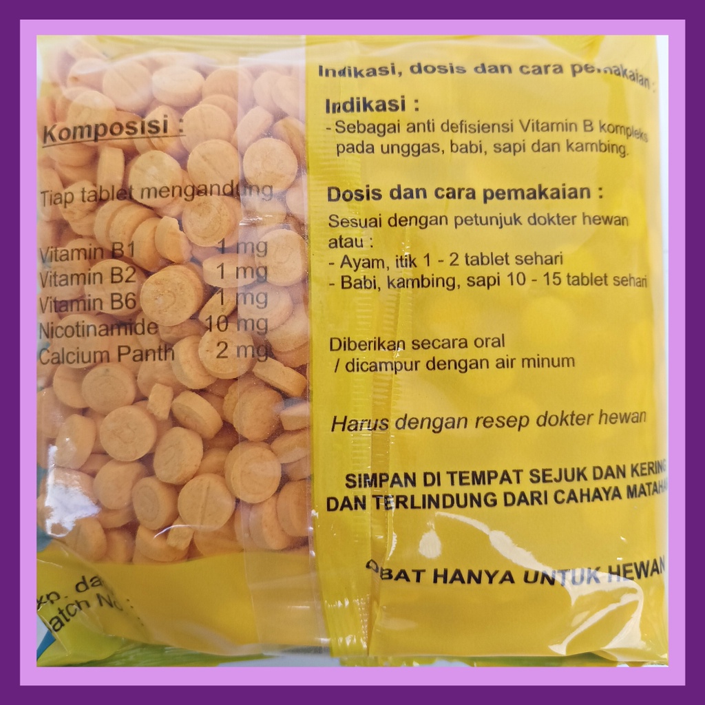Indikasi Mencegah defisiensi atau gangguan yang timbul karena kekurangan vitamin B pada hewan ternak Digunakan untuk mempercepat pertumbuhan dan menjaga kesehatan hewan ternak Untuk meningkatkan nafsu makan pada hewan ternak yang sedang sakit Berguna sebagai vitamin tambahan pada masa kehamilan Kontra Indikasi Tidak ada.