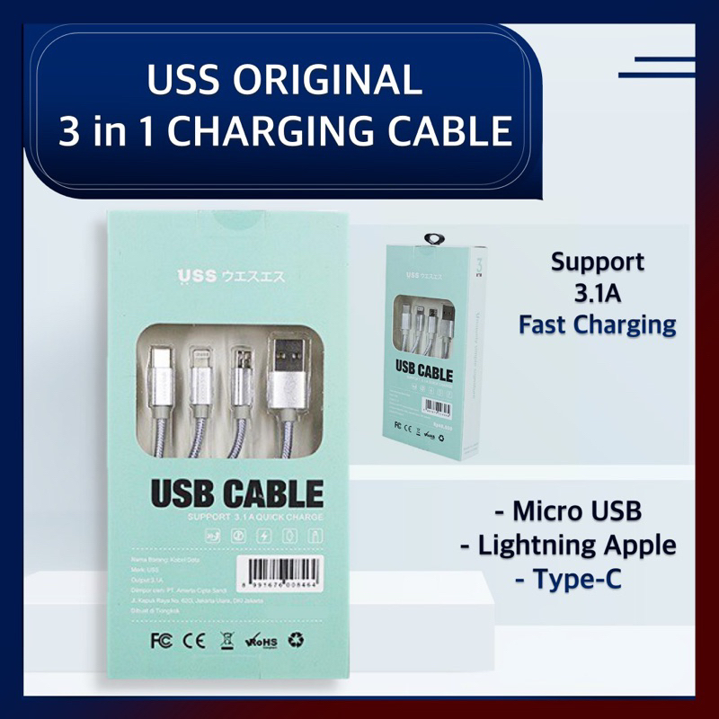 Detail USS Kabel 3in1 3A Fast Charging Hp iphone xiaomi Type C Lightning USB Quick charger cable Android premium original