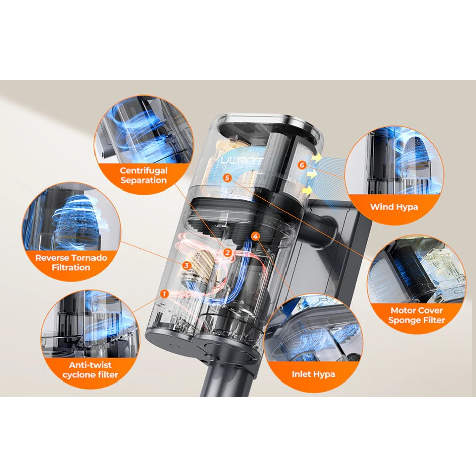 Fitur: -Super strong suction,High 265aw -Innovative 4 in 1 all-round base station -Dual dust cup dust separation technology -Advanced 6-layer filtration system for superior air quality. -Four cleaning modes to meet different cleaning needs. *Standard Mode for light debris on floors *Strong Mode for hard surfaces like tiles *Smart Mode automatically adjusts suction based on dust level *Super Mode provides extra power for tough cleaning like carpets -Powerful and durable vacuum battery 60min long battery life to meet daily needs -Smart LED display for easy monitoring and control. -Choose from five brush heads to suit your cleaning needs