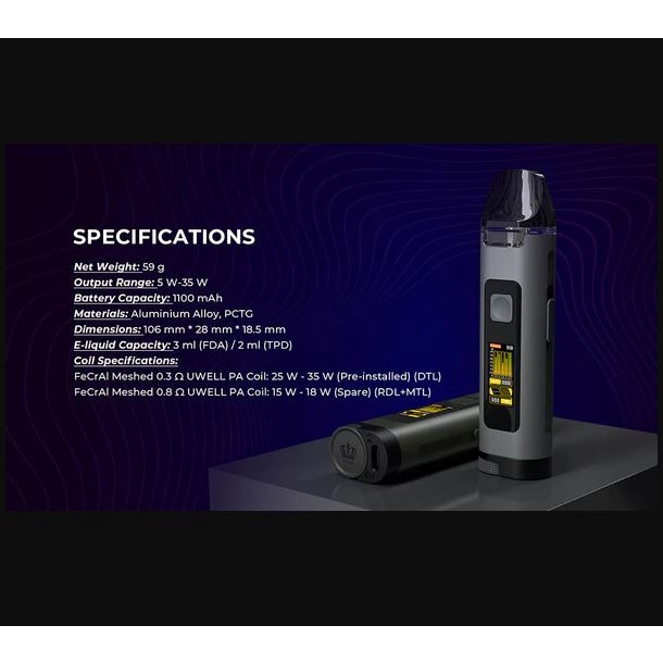 Uwell Crown D Pod Mod 1100mAh By Uwell - Dimensions: 106mm by 28mm by 18.5mm - Chassis Material: Aluminum-Alloy - Wattage Range: 5-35W - Battery Capacity: 1100mAh - Charging Port: Type-C - Output: Power, Volt, Curves, Bypass - Operation: Dual-Activation (Draw+Button) - Fill System: Top Fill System - Pod Capacity: 3mL - Coil Support: Uwell PA Coil Series - Coil Installation: Press Fit - Pod Connection: Magnetic . What’s Included: 1- Crown D Device 1- Crown D Cartridge 1- 0.3ohm PA Coil 1- 0.8ohm PA Coil 1- Type-C Cable 1- User Manual