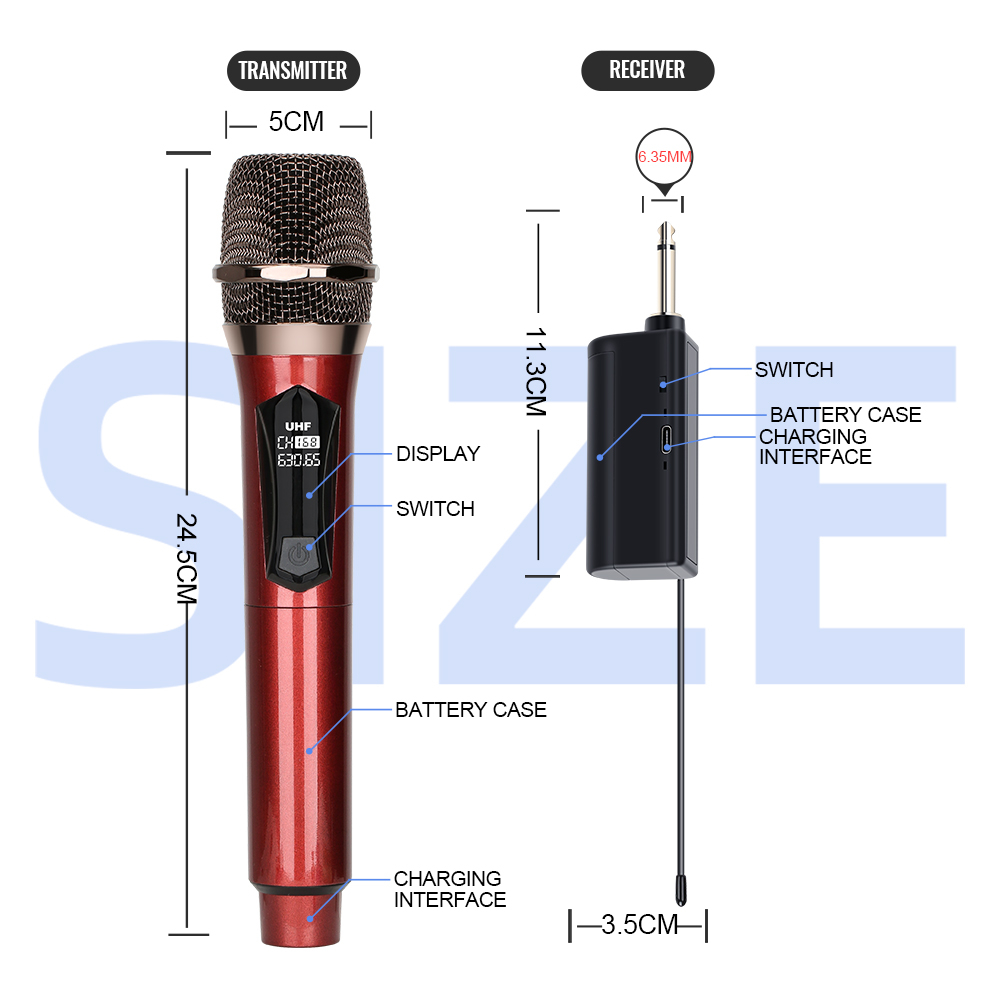 UX01 / UX02 profesional mikrofon nirkabel genggam profesional mikrofon mengambang UHF dalam ruangan luar ruangan K lagu mikrofon nyanyian panggung rumah lagu K dapat dihubungkan ke peralatan audio antarmuka MIC Asli antarmuka tipe-c baru COD 6.35MM UB02 Penerima U-band UHF band, tidak mudah untuk crosstalk, tidak mudah untuk menjatuhkan garis, penerimaan sinyal lebih kuat Pasang dan mainkan, tidak perlu dicolokkan, perangkat harus memiliki mikrofon atau antarmuka MIC Ponsel, TV, komputer, dan perangkat lain yang hanya memiliki antarmuka audio tidak dapat digunakan sendiri, mikrofon tidak dapat dihubungkan melalui Bluetooth (ponsel, TV, komputer perlu dipasangkan dengan amplifier/speaker dan perangkat lain yang memiliki antarmuka mikrofon atau MIC sebelum dapat digunakan) Dukungan saluran suara: mono Mode FM: modulasi digital Baterai mikrofon: 18650 3.7V Jarak antara pemancar dan penerima:> 50m Respons frekuensi: 65Hz-15kHz Rasio sinyal terhadap kebisingan:> 60dBA Pita frekuensi UHF: 620-670MHz Waktu kerja baterai penerima: 4-6 jam