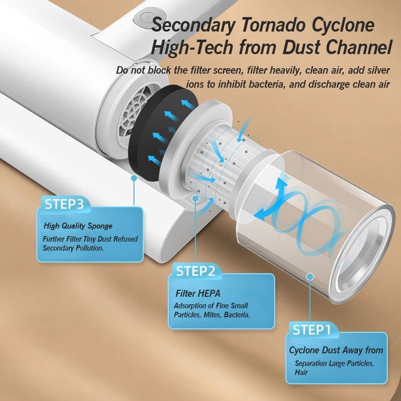 Fitur : 1. 200.000 kali getaran frekuensi tinggi dapat dengan cepat mengelupas tungau debu. 2. Baterai yang dipatenkan, pengisian inovatif nirkabel, singkirkan belenggu kabel. 3. Udara panas 50 ° untuk pemanasan tambahan, knalpot sudut miring 45 °, pemanasan cepat & peredam. 4. Hisap kuat 20kpa, gerakan impor berkecepatan tinggi, tarik tungau yang dalam. 5. Sistem tiga filtrasi, menyaring lapis demi lapis, menyaring udara bersih dan segar.