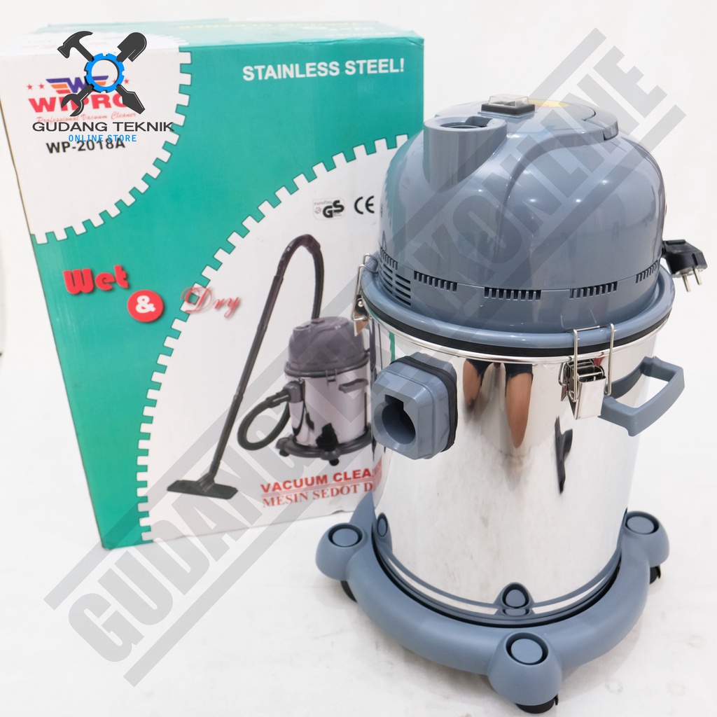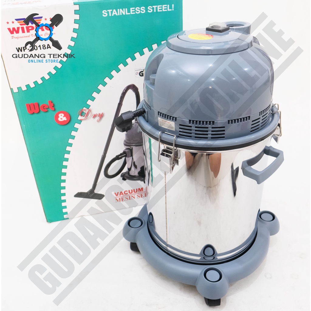 Vacuum Cleaner Wet & Dry Stainless Steel WP 2018 WIPRO adalah alat untuk menyedot debu kering/basah. Vacum cleaner dapat dikelompokkan menjadi 2 yaitu Dry dan Wet. Dry Vacum Cleaner adalah mesin penyedot yang dapat menyedot sampah-sampah kecil dan debu keadaan kering sedangkan Wet Vacum Cleaner adalah mesin penyedot debu yang dapat menyedot sampah-sampah kecil dalam keadaan basah.