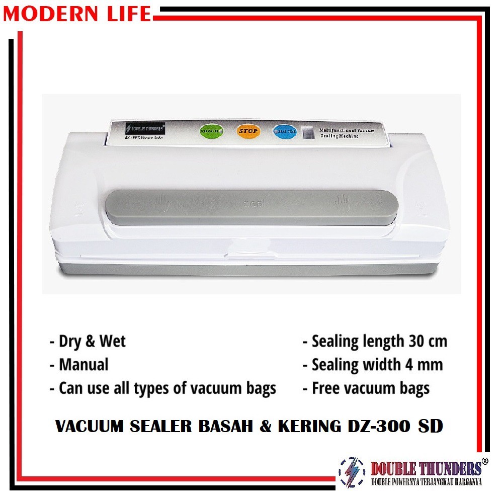 Jenis Barang : Vacuum Sealer Portable / Mesin Pengemas Plastik Merk : Double Thunder Type : DZ-300 SD Voltase : 220 V / 50 Hz Daya Listrik : 150 Watt Lebar / Panjang Element Seal : 4 mm / 30 cm Dimensi Mesin ( P x L x T ) : ( 370 x 150 x 85 ) mm