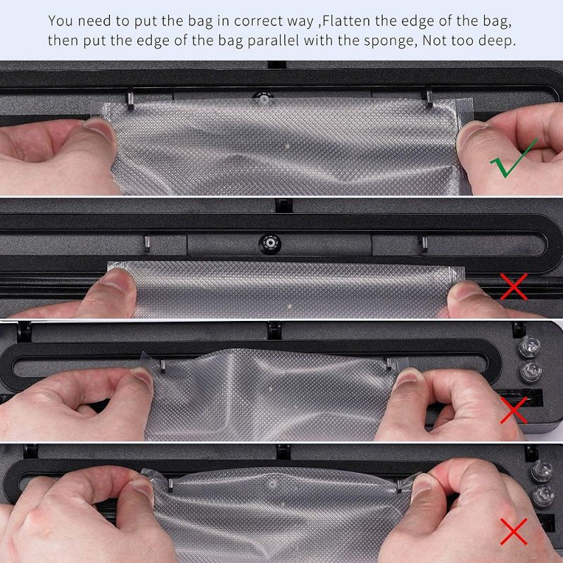1. Untuk mendapatkan efek penyegelan vakum yang lebih baik, JANGAN memasukkan terlalu banyak makanan ke dalam kantong vakum (Maximal 3/4 volume ) 2. Harap gunakan kantong vakum makanan khusus. Saat penyegelan vakum, harap sisi mulus kantong vakum menghadap ke atas. 3. Saat menyegel, untuk mendapatkan efek penyegelan yang lebih baik, TEKAN bagian tengah atas mesin penyegel vakum. (LIHAT VIDEO) 4. Setelah menyalakan mesin, lakukan pemanasan selama 30 detik, baru di gunakan.Beri jeda waktu istirahat 1 - 2 menit di setiap melakukan proses vakum sealer. Catatan: Jika proses segel vakum terlalu sering dilakukan dalam waktu singkat, kantong vakum bisa meleleh karena suhu yang lebih tinggi. 5. Jangan mengisi kantung plastik vakum terlalu banyak, sisakan ruang yang cukup di ujung kantung yang terbuka agar kantung dapat ditempatkan di ruang vakum dengan tepat. 6. Tempat vakum , plastik vakum TIDAK BOLEH BASAH, proses segel bisa gagal. 7. Bersihkan dan rapikan kantong plastik segel sebelum menyegel. Kerutan / adanya barang di ujung kantong plastik segel bisa menyebabkan gagal segel.
