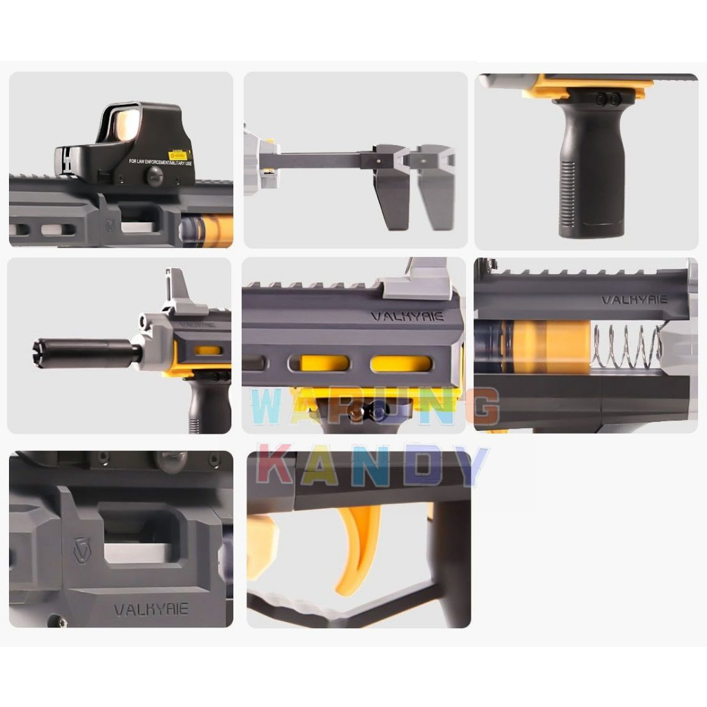 Kelengkapan 1x Valkyrie Sembylon 2x Spring 1x Return Spring 1x Mag 1x Metal Barrel 1x Iron Sight 1x Dummy Red Dot 1x Bcar 1x Manual 1x Vertical Grip 20x Half Lenght Dart 1 Set Spare Oring