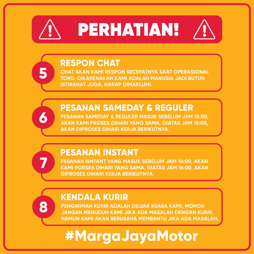 Marga Jaya Motor Hari minggu + tanggal merah toko tutup Waktu operasional toko Senin s/d Sabtu Jam 8:00 s/d 17:00 Untuk pengiriman cepat disarankan memakai GO SEND / GRAB