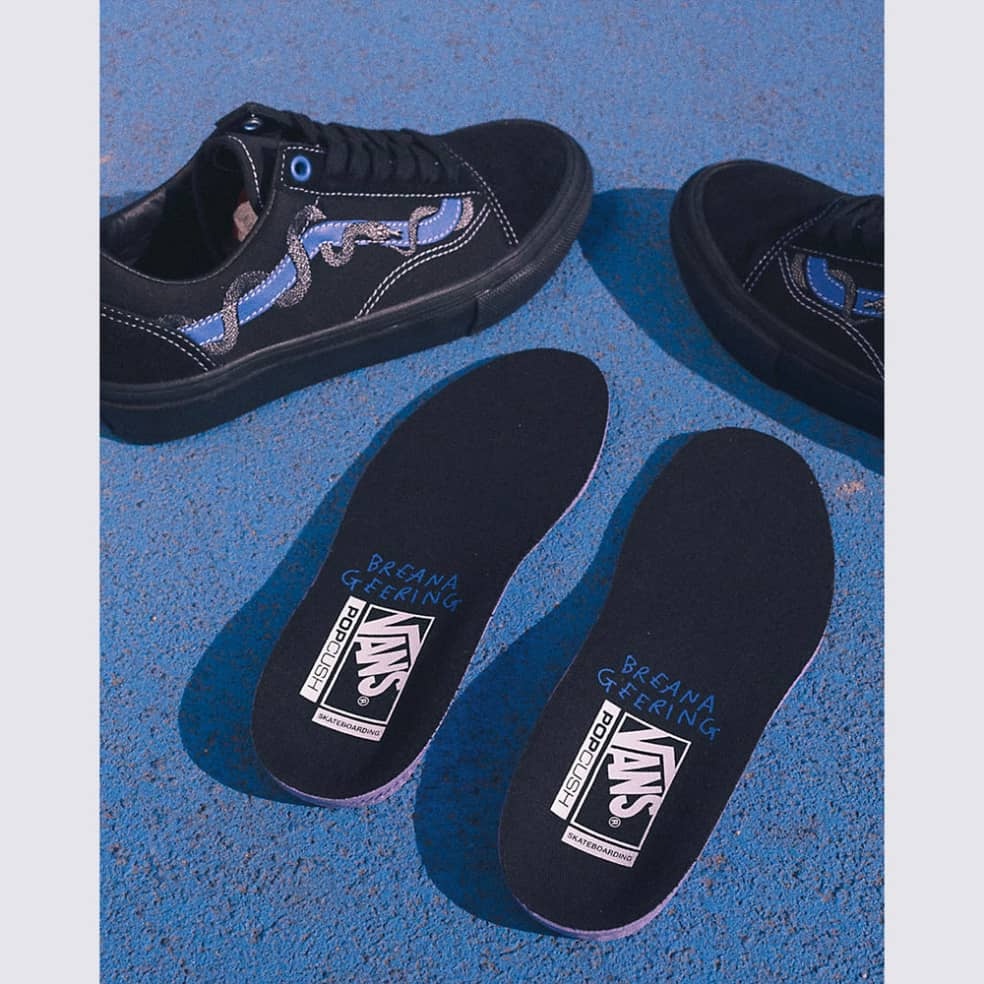 • BREANA GEERING SIGNATURE COLLECTION - Built with suede and 283 g canvas uppers, this Skate Old Skool™ features an all-black colorway with contrast white stitching and a snake slithering across the sidestripe. • INCREASED DURABILITY - DURACAP™ reinforced materials, deeper knurl texture on the toe bumpers, and higher sidewall heights provide a more heritage look with increased durability and protection. • FULLY REDESIGNED UPPERS - Reconstructed with a molded heel counter and internal tongue straps for a locked-in fit and more board control. • LEGENDARY GRIP - Our new, proprietary SickStick™ gum rubber compound is our stickiest rubber yet. • POPCUSH CUSHIONING - Our best cushioning and impact protection. POPCUSH™ energy return footbeds protect your feet while helping to lessen leg fatigue for longer skate sessions.