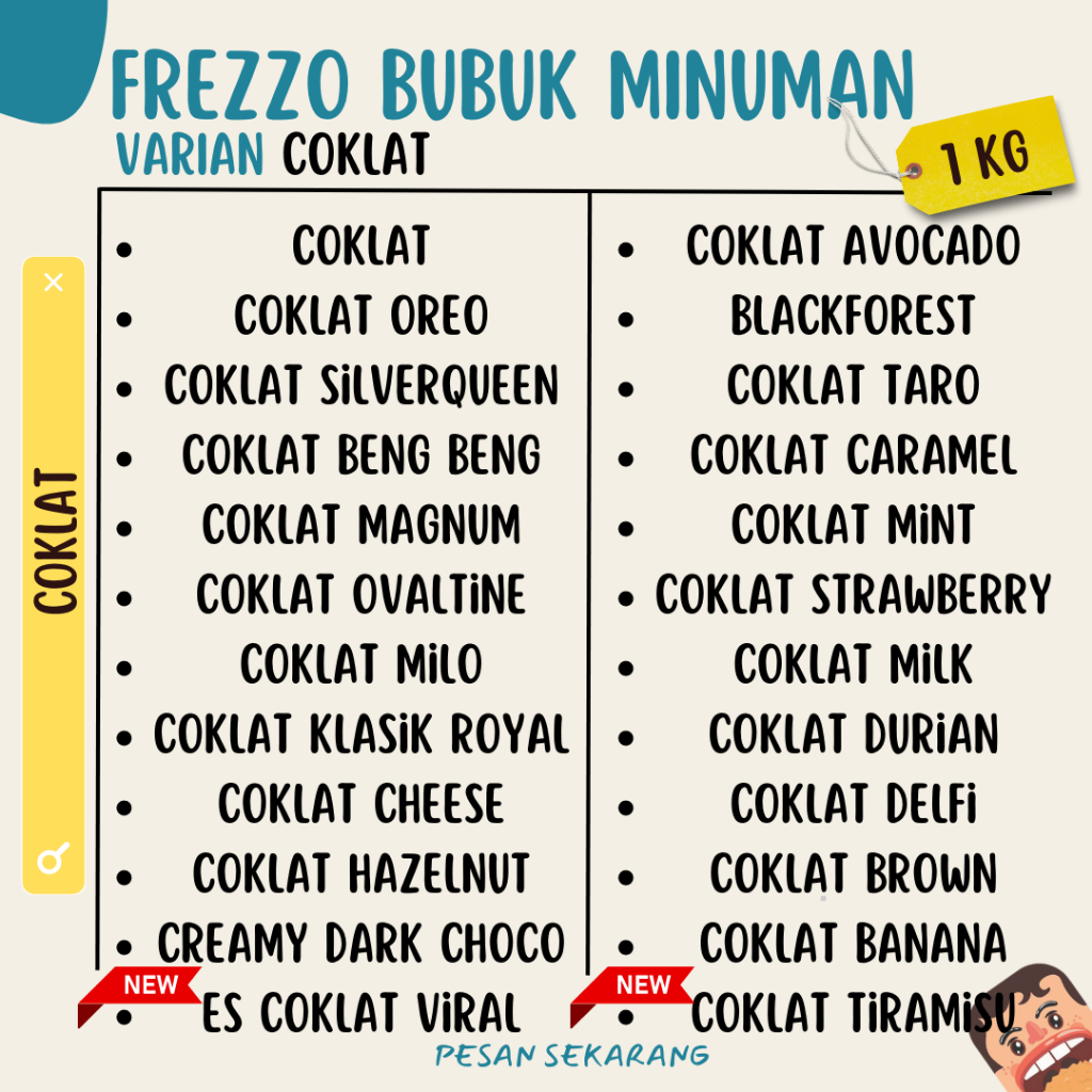 - Coklat - Coklat Oreo - Coklat Silverqueen - Coklat Beng Beng - Coklat Magnum - Coklat Ovaltine - Choco Milo - Coklat Klasik Royal - Coklat Cheese - Coklat Hazelnut - Creamy Dark Choco - Coklat Avocado - Blackforest - Coklat Taro - Coklat Caramel - Coklat MInt - Coklat Strawberry - Coklat Milk - Coklat Durian - Coklat Delfi - Coklat Brown - Coklat Banana - Coklat Tiramisu ( New ) - Es Coklat Viral ( New )