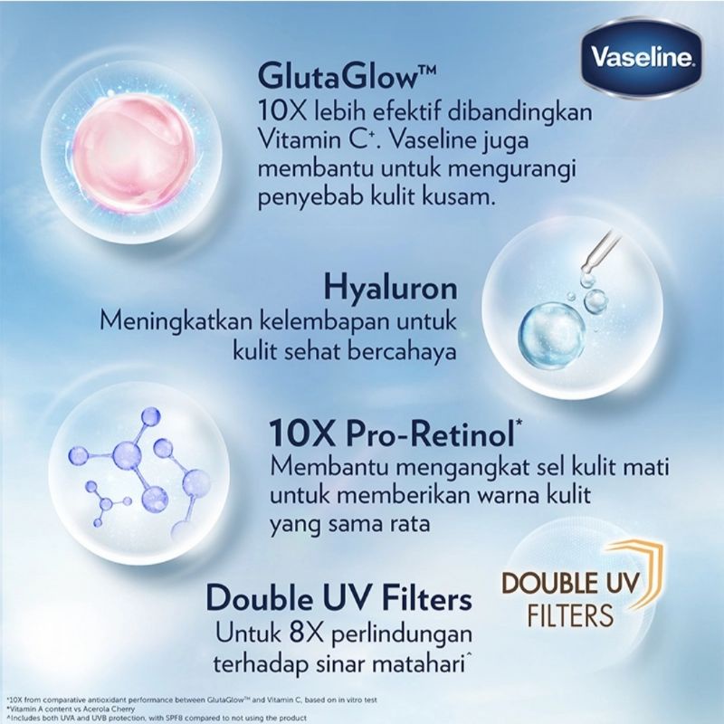 VASELINE Serum Lotion Gluta Hyaluron UV Flawless Bright 200ml adalah serum lotion pertama dari Vaseline. Dengan kandungan Glutathione untuk mencerahkan dan membuat warna kulit tampak merata. Memiliki teknologi Hyaluron dan GlutaGlow yang 10x lebih kuat dari Vitamin C yang membuat kulit tampak lembab dan bersinar.