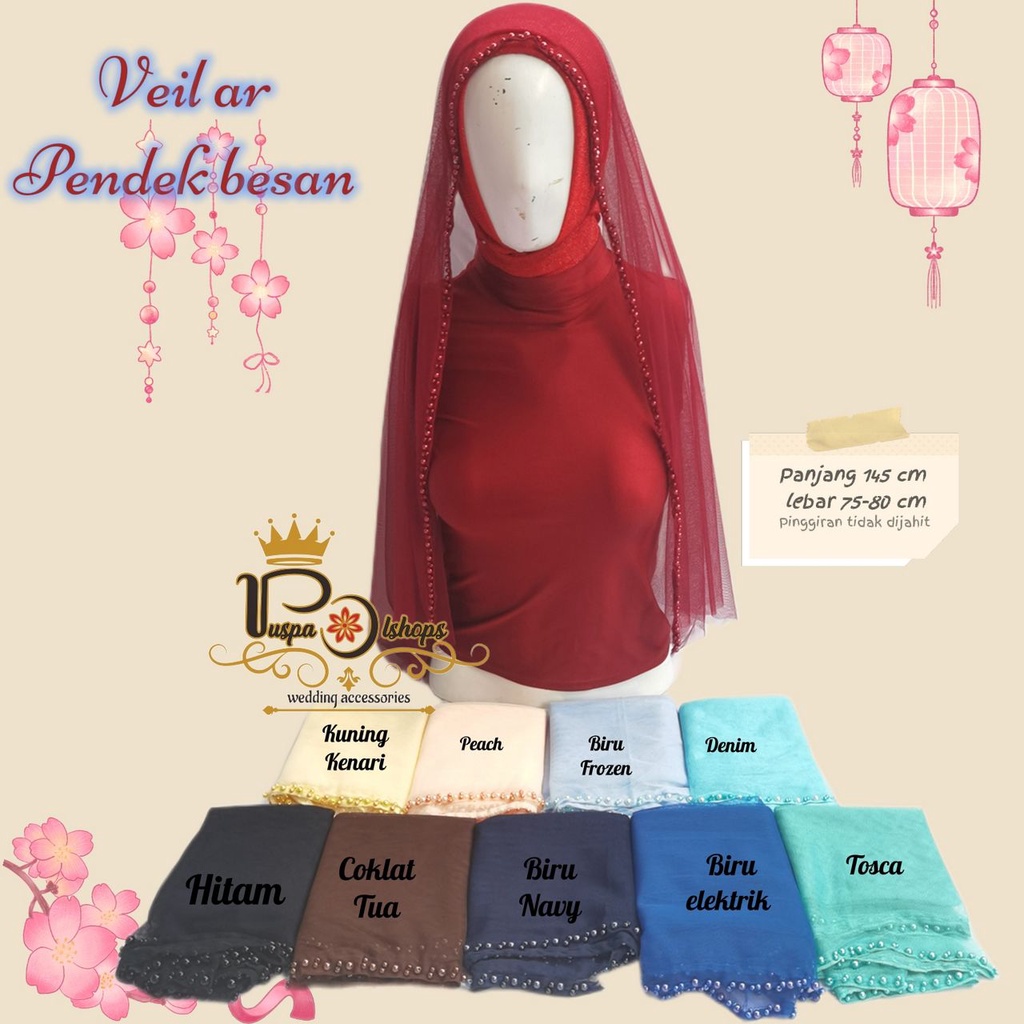 Veil mutiara murah terbuat dari bahan tile murah yang dipayet dengan mutiara. Untuk tile ini bukan jenis tipical tile silk seperti non motif akan tetapi kami menggunakan kualitas tile standart tidak terlalu halus . untuk besan ukuran lebih pendek dari pengantin,memiliki ukuran panjang145 cm lebar 75- 85 cm untuk bagian depan tetap dipayet mutiara tetapi tidak sepadat untuk pengantin mutiaranya. bagian bawah juga tidak dijahit