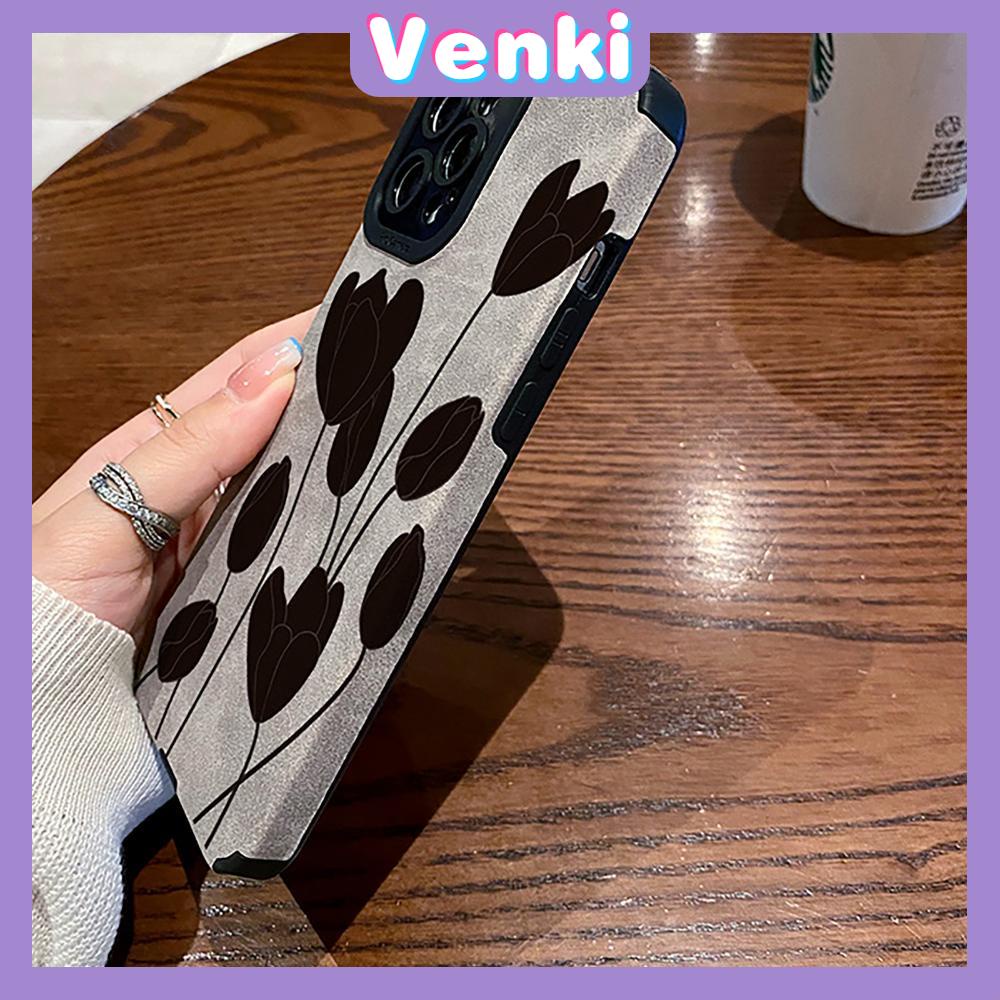 VENKI - Untuk iPhone 11 Case Leather Pupil Suede Case Soft Shockproof Case Camera Simple Black Flower Kompatibel dengan iPhone 14 13 Pro max 12 Pro max xr xs 7Plus 8Plus