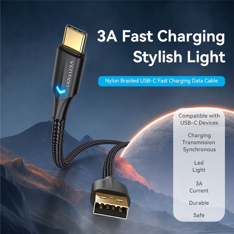 Handphone & Aksesoris > Kabel, Charger, & Konverter > Kabel & Adaptor Handphone > Vention Kabel Data USB A to Type C Braided 3A Fast Quick Super Charge