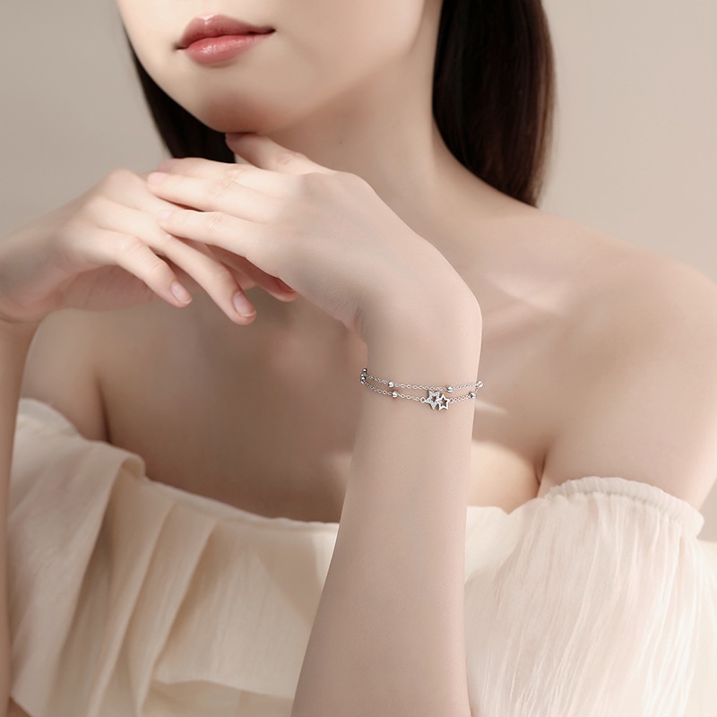 Aksesoris Fashion > Gelang Tangan & Bangle > Versi Korea Sterling Silver Gelang Bintang Berujung Lima Platinum Kecil Segar Double-layer Gelang Manik Perak ins Desain All-match Perhiasan Tangan Unik