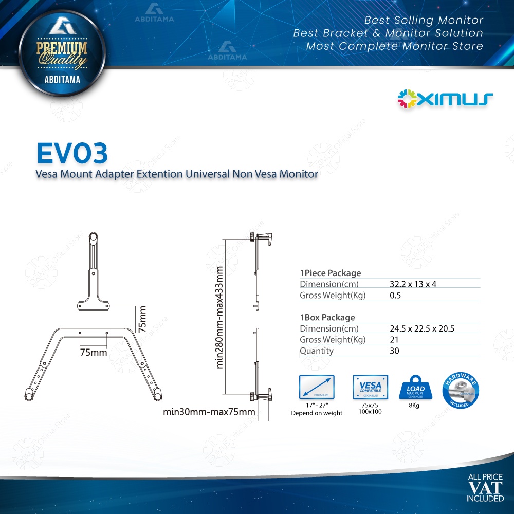 OXIMUS EV03 merupakan Vesa Adapter Extention dimana digunakan untuk monitor yang tidak memiliki VESA, supaya tetap bisa menggunakan bracket. Terdiri dari 3 bagian untuk mengapit monitor, mudah pemasangan, kokoh dan flexibilitas yang tinggi.