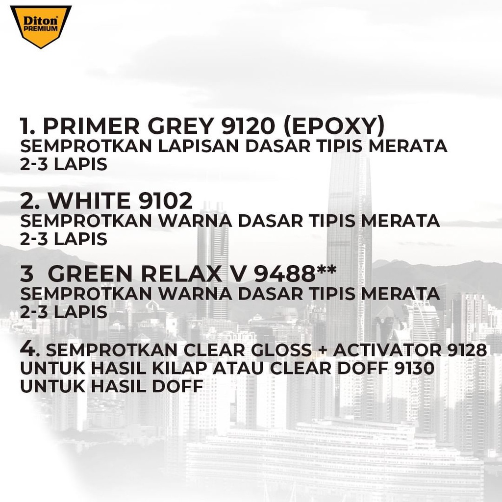 Tahapan penggunaan: 1. Gunakan Epoxy Primer Grey 9120 2. Warna Dasar 9102 White 3. Semprot warna yang diinginkan tipis merata (2-3 lapis) 4. Gunakan Clear 9128 untuk hasil akhir yang mengkilap.