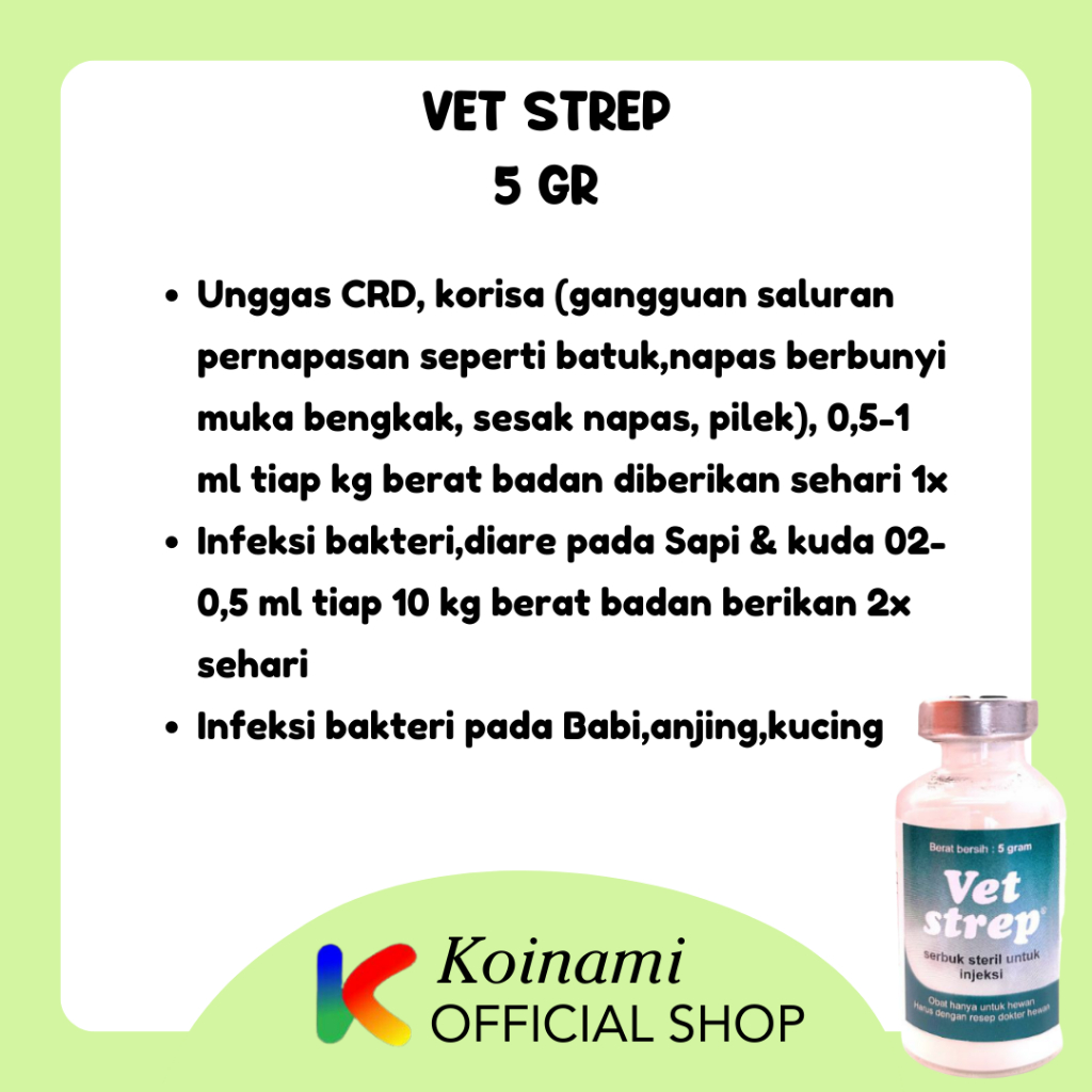 VETSTREP merupakan obat injeksi untuk mencegah dan mengobati infeksi pernafasan dan pencernaan pada unggas, hewan besar dan hewan kecil.