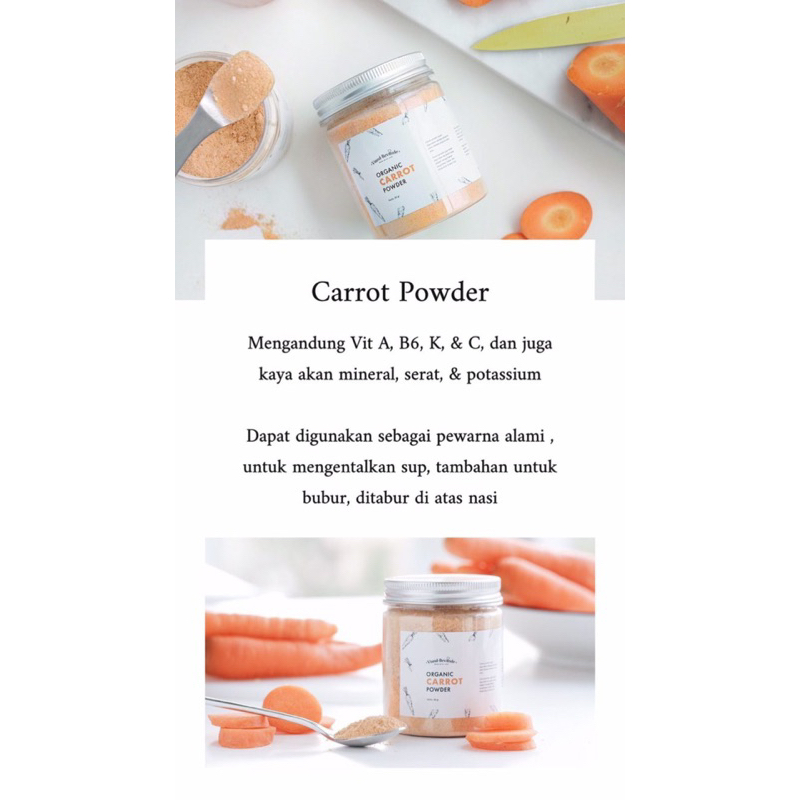 Wortel mengandung vitamin A, K, C dan B6, selain itu juga kaya akan mineral, serat dan potasium yang baik untuk kesehatan tubuh. Carrot powder ini mengandung segala kebaikan dari wortel tersebut. Dapat digunakan untuk MPASI atau untuk orang dewasa. Ditabur di atas bubur, nasi atau dimasukkan ke dalam masakan seperti sup dan dapat membantu mengentalkan serta menambahkan warna secara alami.