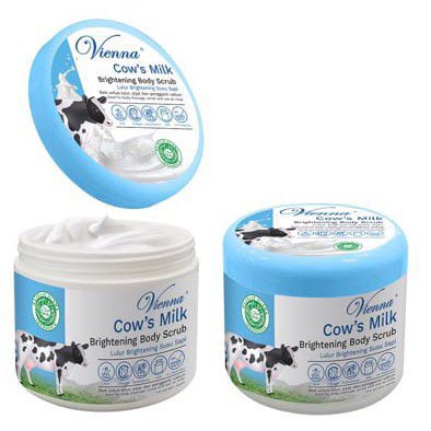 VIENNA BODY SCRUB COW'S MILK LULUR SUSU SAPI -250G POT Lulur Whitening Cow's Milk Susu yang telah diformulasi dengan susu yang kaya akan protein, vitamin dan mineral. susu sapi kaya akan pelembap dan membantu memberikan nutrisi penting untuk kulit. Dengan anti-oksidan, merawat warna kulit yang sehat, anti-aging dan melindungi kulit dari bahaya sinar UV serta AHA untuk mencerahkan dan menjadikan kulit tampak putih. Collagen untuk menghaluskan dan merawat kekencangan kulit agar tampak muda. Mengangkat sel kulit mati dan kering agar kulit lembut, halus, segar dan berseri-seri.