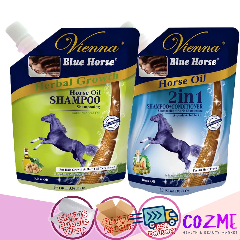 - VIENNA BLUE HORSE SHAMPOO 2IN1 - 150ML POUCH Shampo dengan perawatan intensif untuk membersihkan dan merawat rambut serta kulit kepala. Diformulasikan dengan nutritive oil alami minyak Avocado dan Jojoba untuk menutrisi dan melembabkan semua jenis rambut. Vitamin A, Vitamin C dan Vitamin E untuk merawat rambut dari akar hingga ujung rambut agar tampak lebih kuat dan sehat. Membantu merawat rambut agar tidak rusak, kering dan kusam. Membuat rambut tampak indah, berkilau alami dan segar sepanjang hari.
