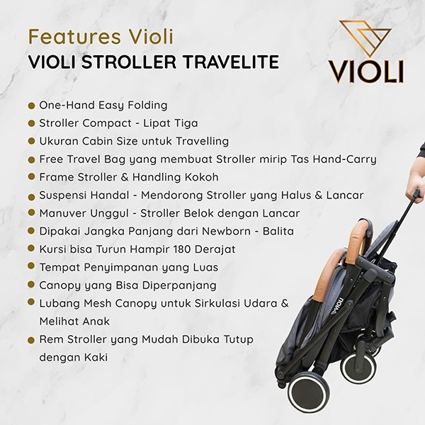 Weight : 5,5kg Dimension Open : 35*70*103 cm Folded : 37*24*59 (lebar x panjang dalam x tinggi) Violi Stroller adalah stroller bayi high quality dengan fitur-fitur lengkap dengan one-hand-handling dan high manoeuvrability.