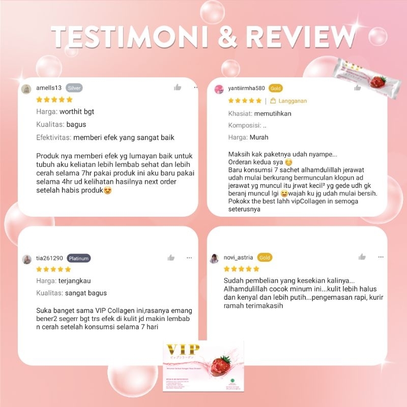 Manfaat VIP: • Mencerahkan kulit & wajah • Merawat keremajaan dan Mengencangkan kulit • Melembabkan kulit • Menjaga elastisitas kulit • Mengurangi peradangan jerawat • Membantu menyamarkan flek dan bekas jerawat • Merawat kesehatan tulang, kuku dan rambut