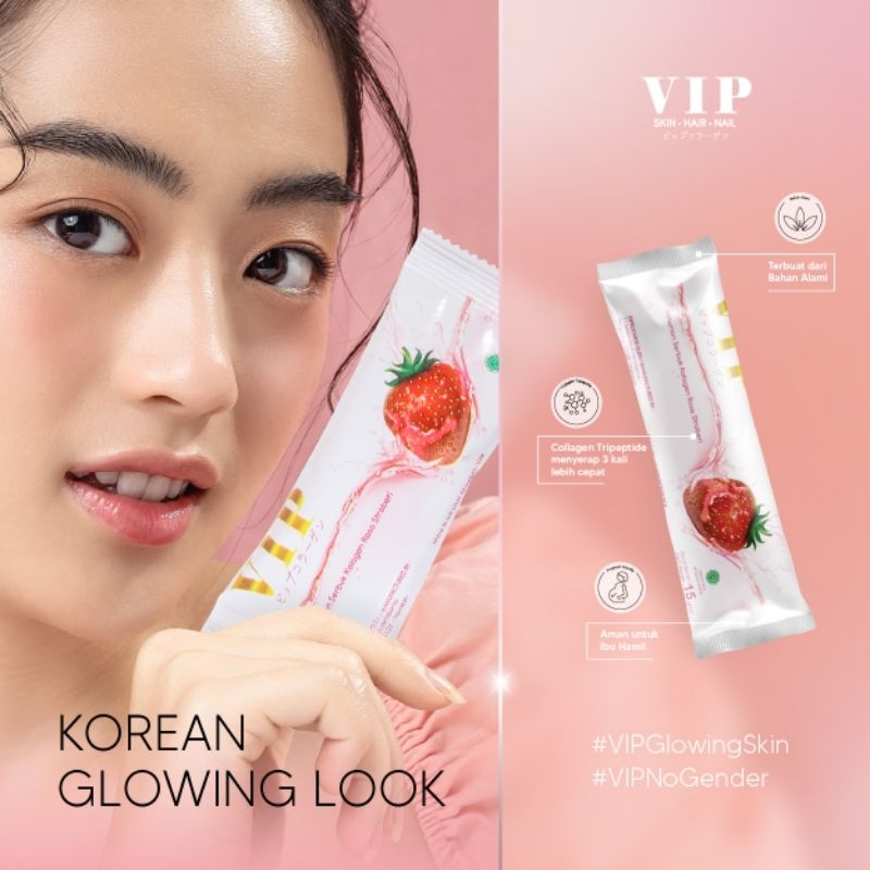 Kandungan VIP Collagen : Fish Collagen Tripeptide, L-Glutathione Grade A, Vitamin C, Strawberry, Redbeet, Pemanis Alami dari daun stevia.