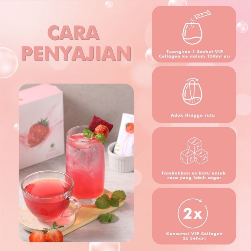 Kandungan VIP Collagen : Fish Collagen Tripeptide, L-Glutathione Grade A, Vitamin C, Strawberry, Redbeet, Pemanis Alami dari daun stevia.