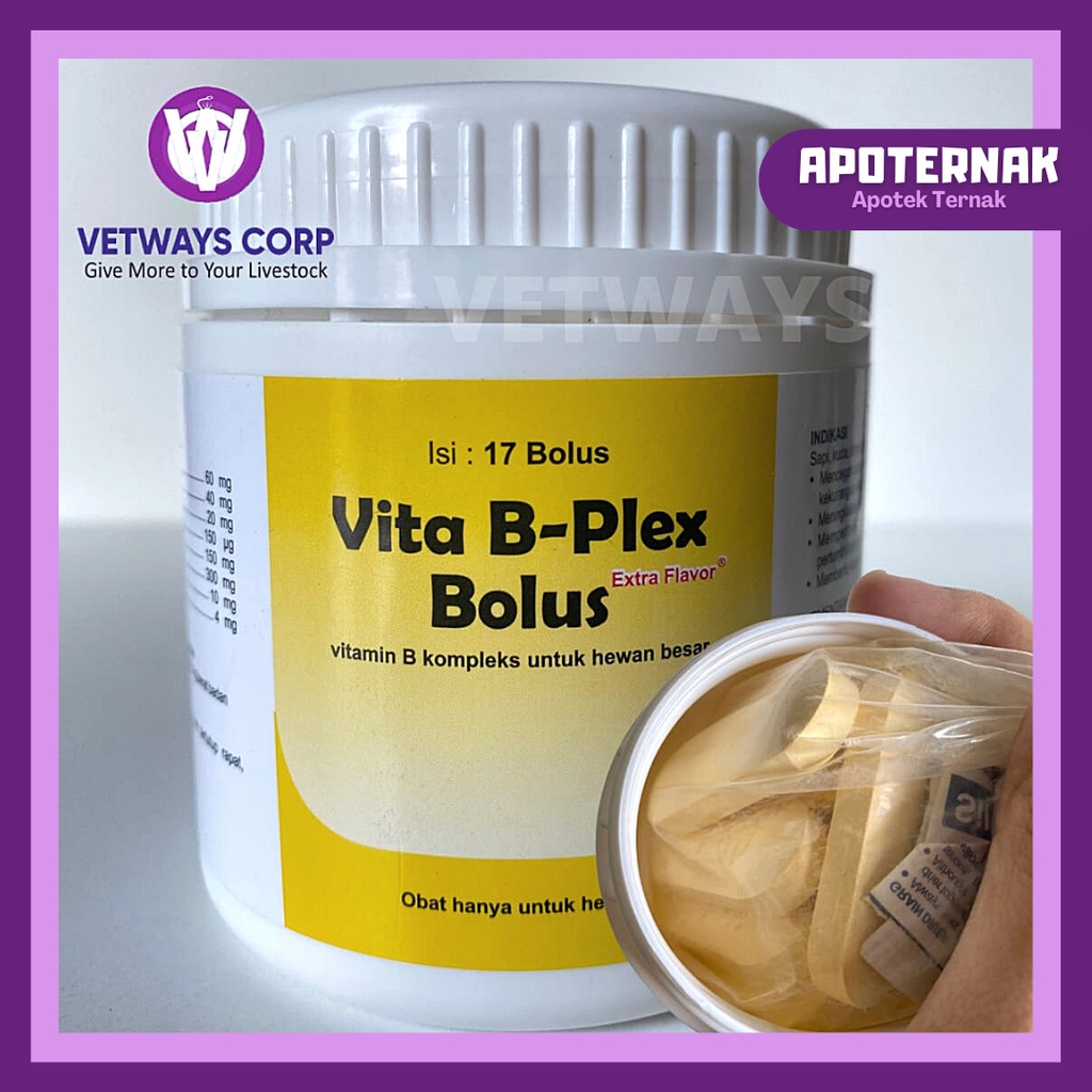 Vita B-Plex Bolus merupakan sediaan berbentuk bolus yang mengandung vitamin B kompleks yang berfungsi sebagai suplemen untuk ternak hewan besar. Vitamin B kompleks merupakan vitamin larut air yang dibutuhkan oleh ternak dengan fungsi utama yaitu sebagai kofaktor enzim yang terlibat dalam metabolisme asam amino, energi, asam lemak, dan asam nukleat.