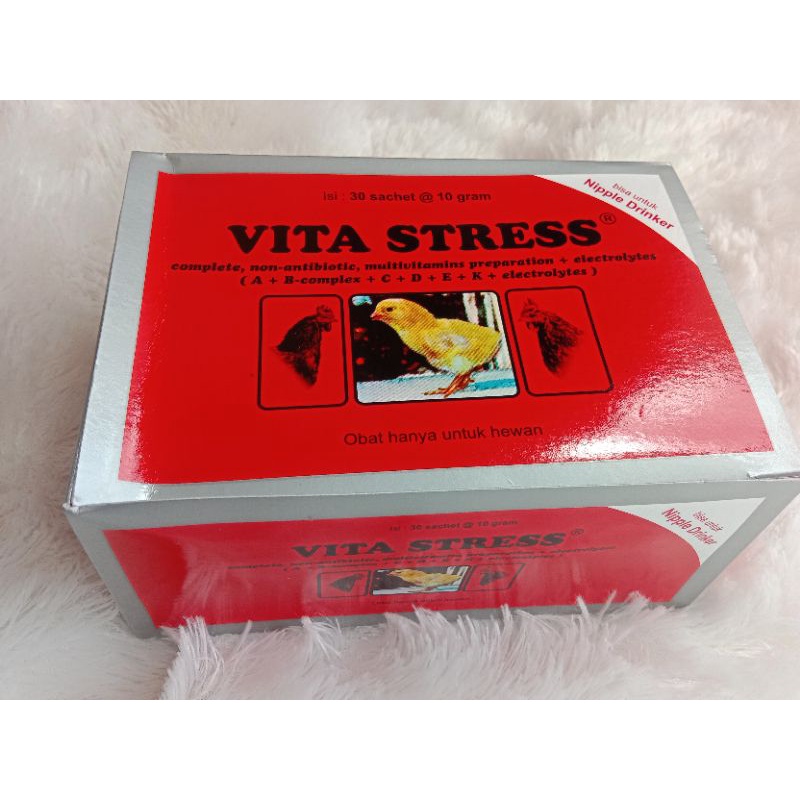 Vita stress merupakan multivitamin untuk ayam isi berupa serbuk larut air berwarna coklat yang mengandung multivitamin dan elektrolit digunakan untuk mengatasi stress pada ayam