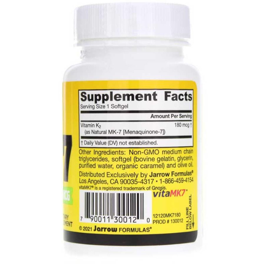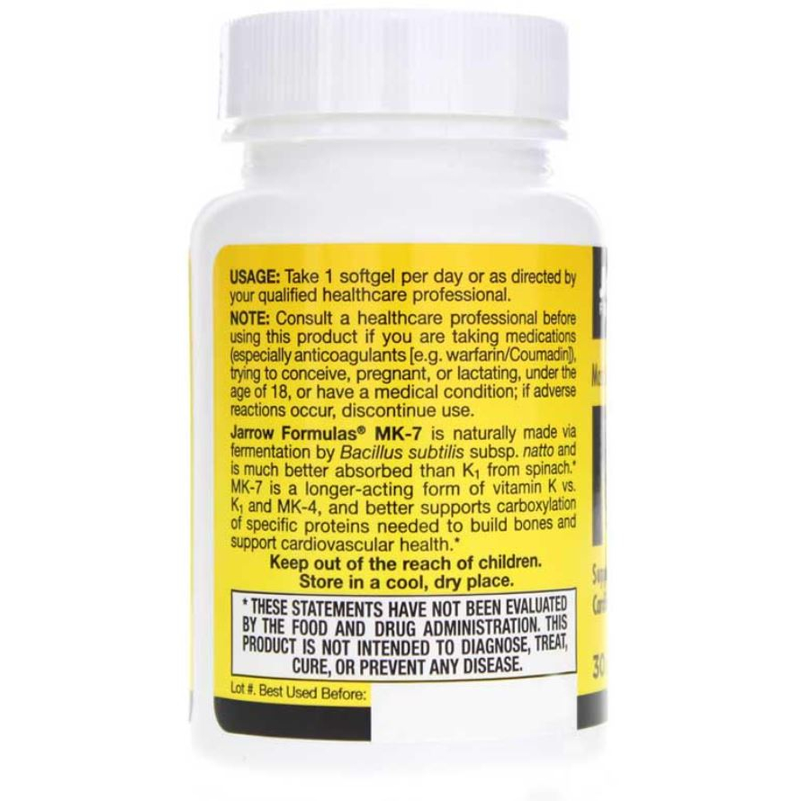 Jarrow Formulas® MK-7 secara alami dibuat melalui fermentasi oleh Bacillus subtilis subsp. natto dan 10X lebih baik diserap daripada K1 dari bayam. MK-7 adalah bentuk vitamin K yang bekerja lebih lama vs. K1 dan MK-4, dan terbukti secara klinis lebih mendukung karboksilasi protein spesifik yang dibutuhkan untuk membangun tulang dan membantu melindungi arteri dari pengendapan kalsium.