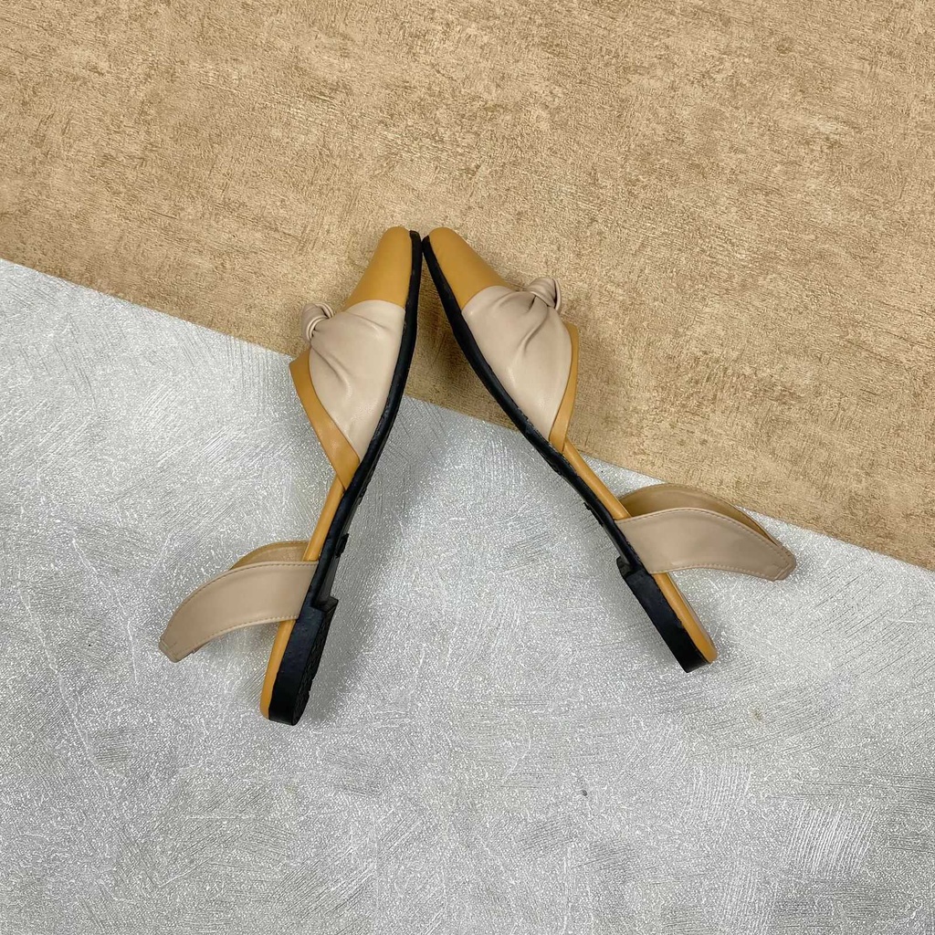 FLATSHOES TALI DENGAN KOMBINASI DUA WARNA, TERLIHAT CANTIK DAN ANGGUN DENGAN AKSESORIS IKATAN PITA MENAMBAH KESAN MEWAH FLATSHOES INI,