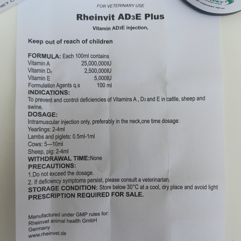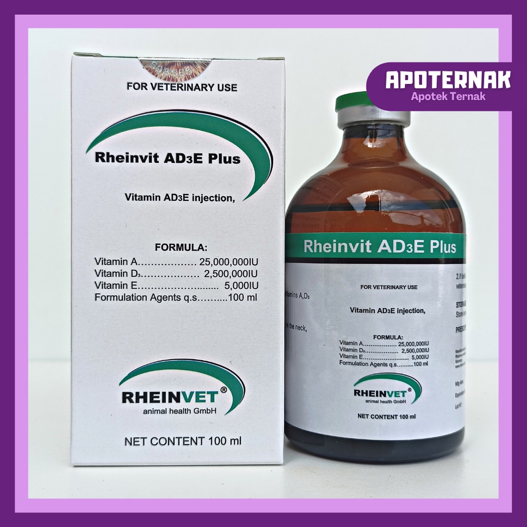 1. Rheinvit AD3E Plus Betis : 1/2 sampai 1 ml. Sapi jantan dan sapi dara : 1 sampai 2 ml. Sapi dewasa : 2 hingga 4 ml. Domba : 1/4 hingga 1/2 ml. Domba tahunan : 1/2 hingga 1 ml. Ovines dewasa : 1 hingga 2 ml. Babi yang disapih : 1/4 hingga 1/2 ml. anak anjing: 1/2 hingga 1 ml. Babi dewasa : 1 hingga 2 ml. Anak anjing : 1 hingga 2 ml.