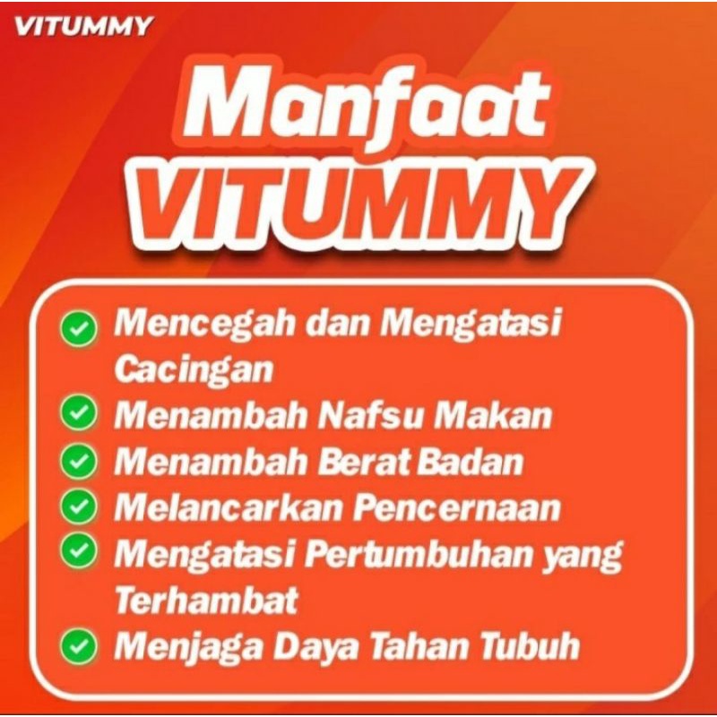 Manfaat Vitummy : โข Mengatasi cacingan pada anak dan orang dewasa โข Mengatasi kurangnya nafsu makan โข Menambah berat badan anak โข Pengatasi perut buncit pada anak โข Melancarkan pencernaan โข Mengatasi masalah pencernaan seperti sembelit dll โข Menjaga daya tahan tubuh โข Mengatasi pertumbuhan yang terhambat