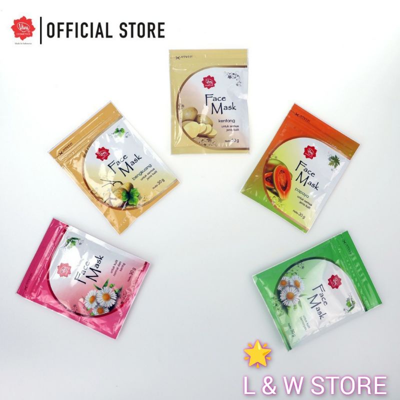 Bagi sista penggemar produk Viva pasti sdh tidak asing lagi dengan produk satu ini. Viva Face Mask kemasan baru netto 30g memiliki 5 varian antara lain: - Viva Face Mask untuk kulit normal kering - Viva Face Mask untuk kulit berminyak - Viva Face Mask Bengkuang (Masker untuk semua jenis kulit, mencerahkan) - Viva Face MAsk Kentang (Masker untuk semua jenis kulit, menghaluskan) - Viva Face Mask Papaya (Masker untuk semua jenis kulit, menghaluskan dan mencerahkan kulit)