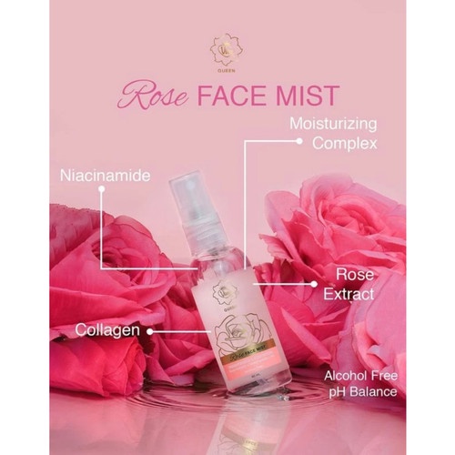 Viva Queen Rose Face Mist dengan kandungan: • Niacinamide merupakan salah satu bentuk Vitamin B3 yang berguna untuk meningkatkan kelembapan kulit, mencerahkan warna kulit, membantu mengatasi jerawat dan bekasnya, mencegah penuaan diri, dan mengatasi hiperpigmentasi akibat paparan sinar matahari