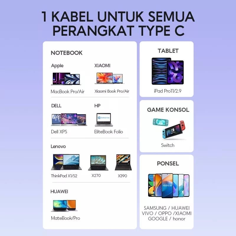 BTK-CC Keunggulan: 1. Daya output 65W dapat mengisi penuh Macbook Pro 13 dalam 2.3 jam dan dapat pula mengisi penuh daya Samsung S10 dalam 1.5 jam. 2. Material kabel sudah melalui uji tekuk selama 10.000 kali, sehingga aman untuk digunakan harian. 3. Dapat digunakan untuk mengisi daya dan mentransfer data. 4. Kompatibel dengan semua perangkat Type-C